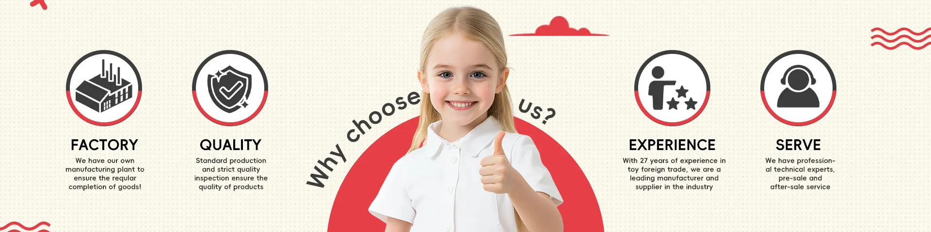 मुख्य उत्पादों: आरसी कार, डायनासोर, लड़की खिलौने, बुलबुला खिलौने, बागवानी खिलौने